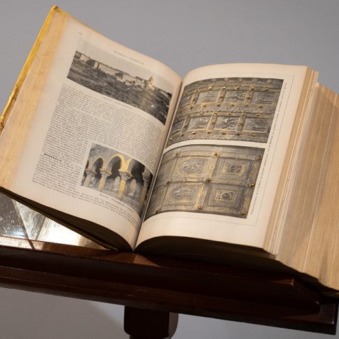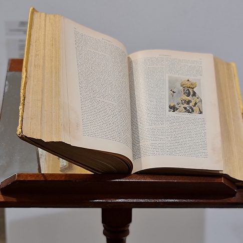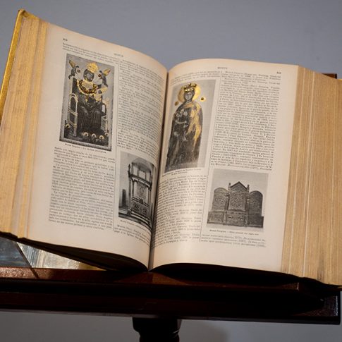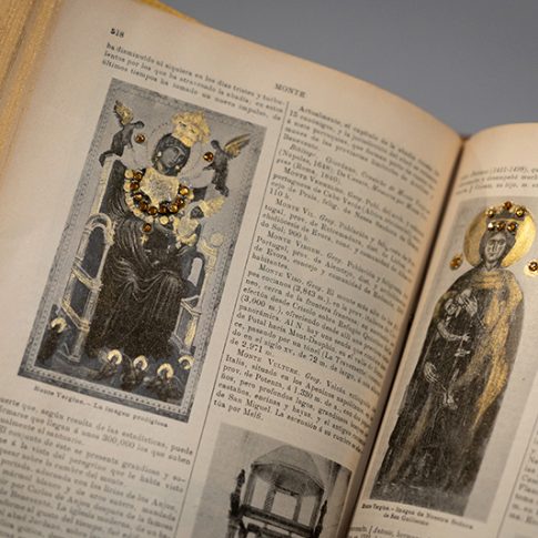 Tomo de enciclopedia con técnica mixta y ornamentos religiosos.