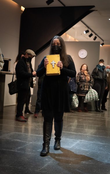 La transformación de un volumen de enciclopedia en un libro religioso. Sonido por Makis Solomos, susurros de palabras del volumen de la enciclopedia combinados con oraciones, discursos del Papa Francisco sobre temas de abuso provocado por el clérigo.