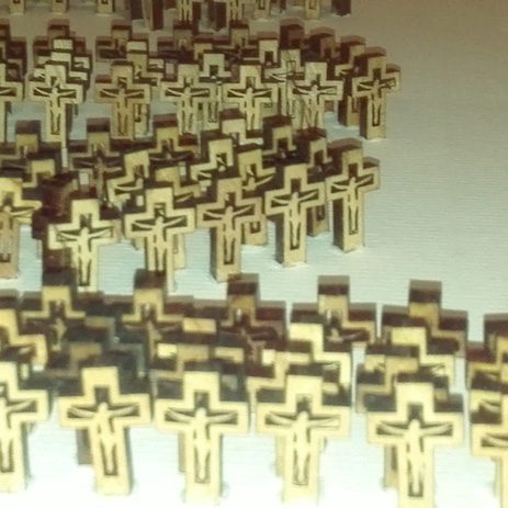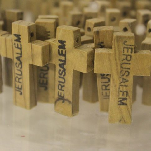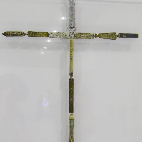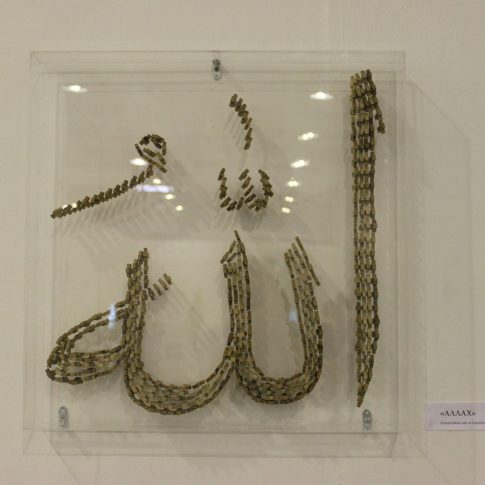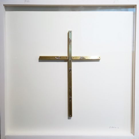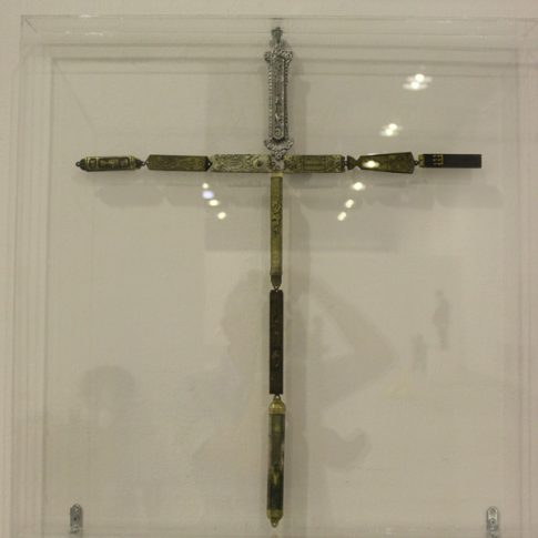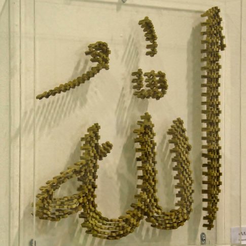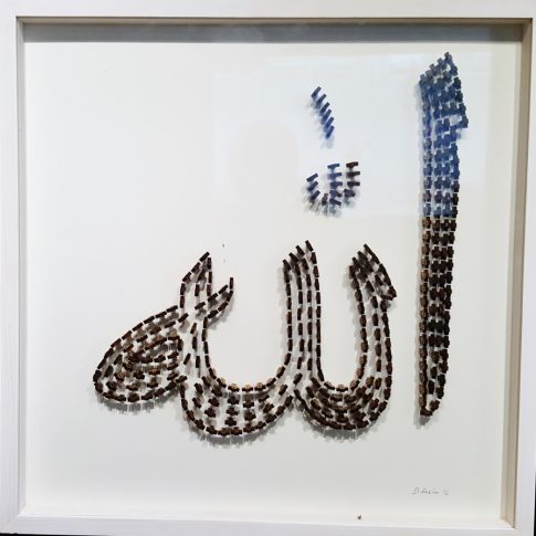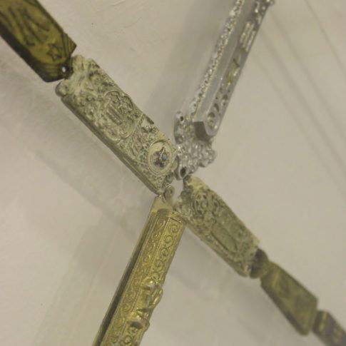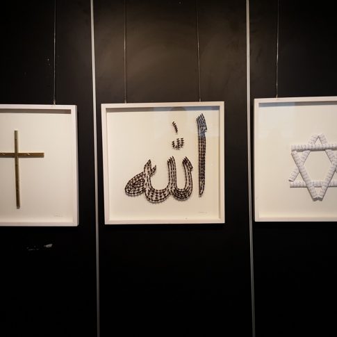 Taking the main sacred symbols of the three monotheistic religions of the Middle East, Judaism, Christianism and Islam, I convert their use, giving them another form. The wooden crosses form the word Allah, the Mezuza a cross and verses of the Koran a David star.