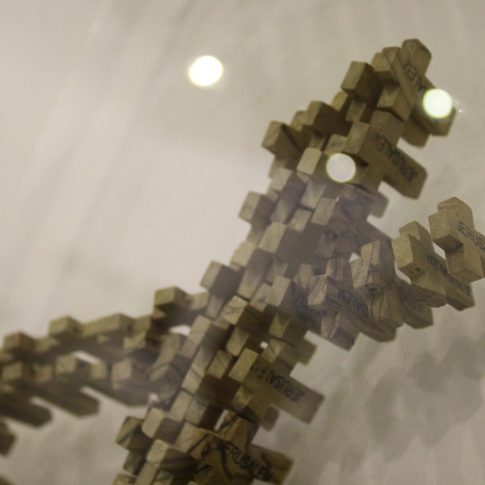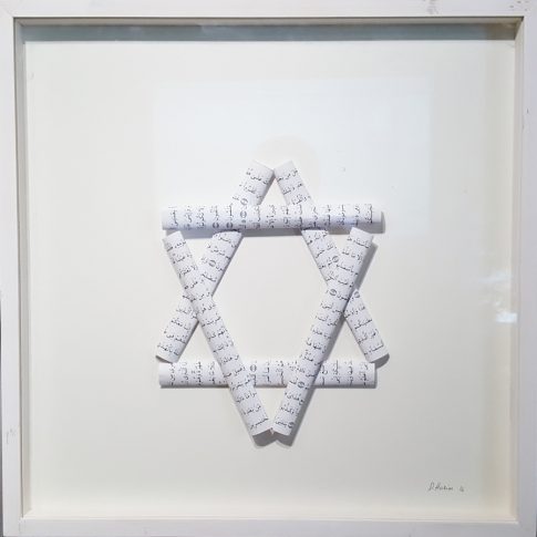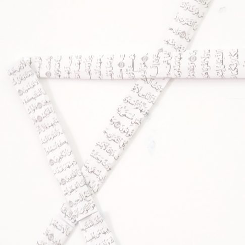 Mi proyecto continúa trabajando sobre el símbolo sagrado de cada una de las tres religiones monoteístas; judaísmo, cristianismo e islam a las que altero su formato y su forma. He realizado la palabra Alá con cruces, una cruz con la Mezuza y una estrella de David con las páginas del Corán.