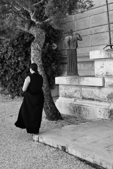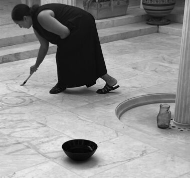 The story begins with a Palestinian lament, “Tallat El-Baroudeh,”, followed by “If I Must Die” by the Gazan poet Refaat Alareer. Arriving at the sea, as the storm breaks, the performer collects water. On her way back, she recalls the story of Dido and Aeneas, lovers separated by a sea, then listens inwardly to flutes from Cameroon. We then enter the second part of the performance, marked by three songs and two brief interludes: the lament of Epirus “Between Three Seas” (Ανάμεσα τρεις θάλασσες) – specially recorded for this performance – which mourns a man swept away by the waves; the chorus of the Medehates (Kabyle women singers of praise) invoking rain in this scorching spring season, mixed with a lament from Uganda; it finishes with Tanaweeh [لتناويح], a traditional Palestinian lament in which a mother bids farewell to her son who is going into exile. Inspired by these songs, the performer writes the names of the missing with seawater like traces of salty tears in letters that fade away like the traces of the deceased evaporating as they merge with the elements.